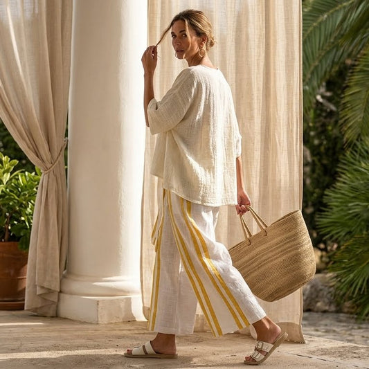 Arianna – Elegant linen set: yellow striped top and wide-leg trousers